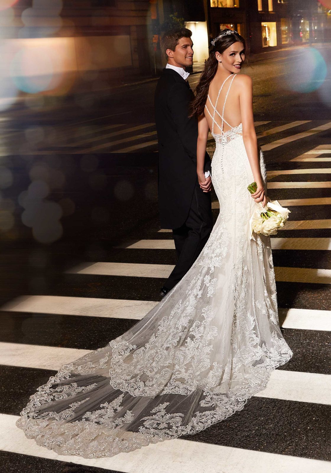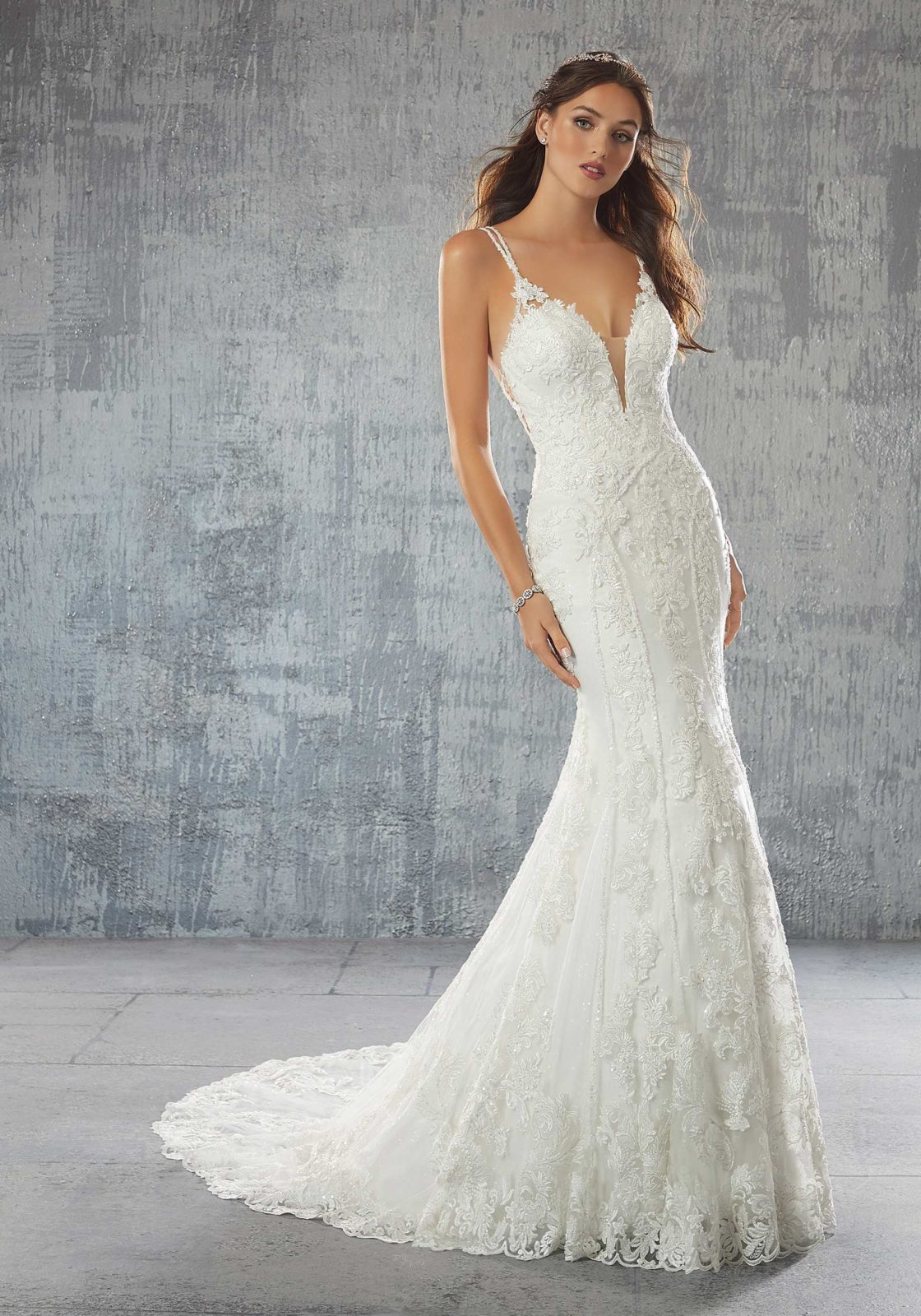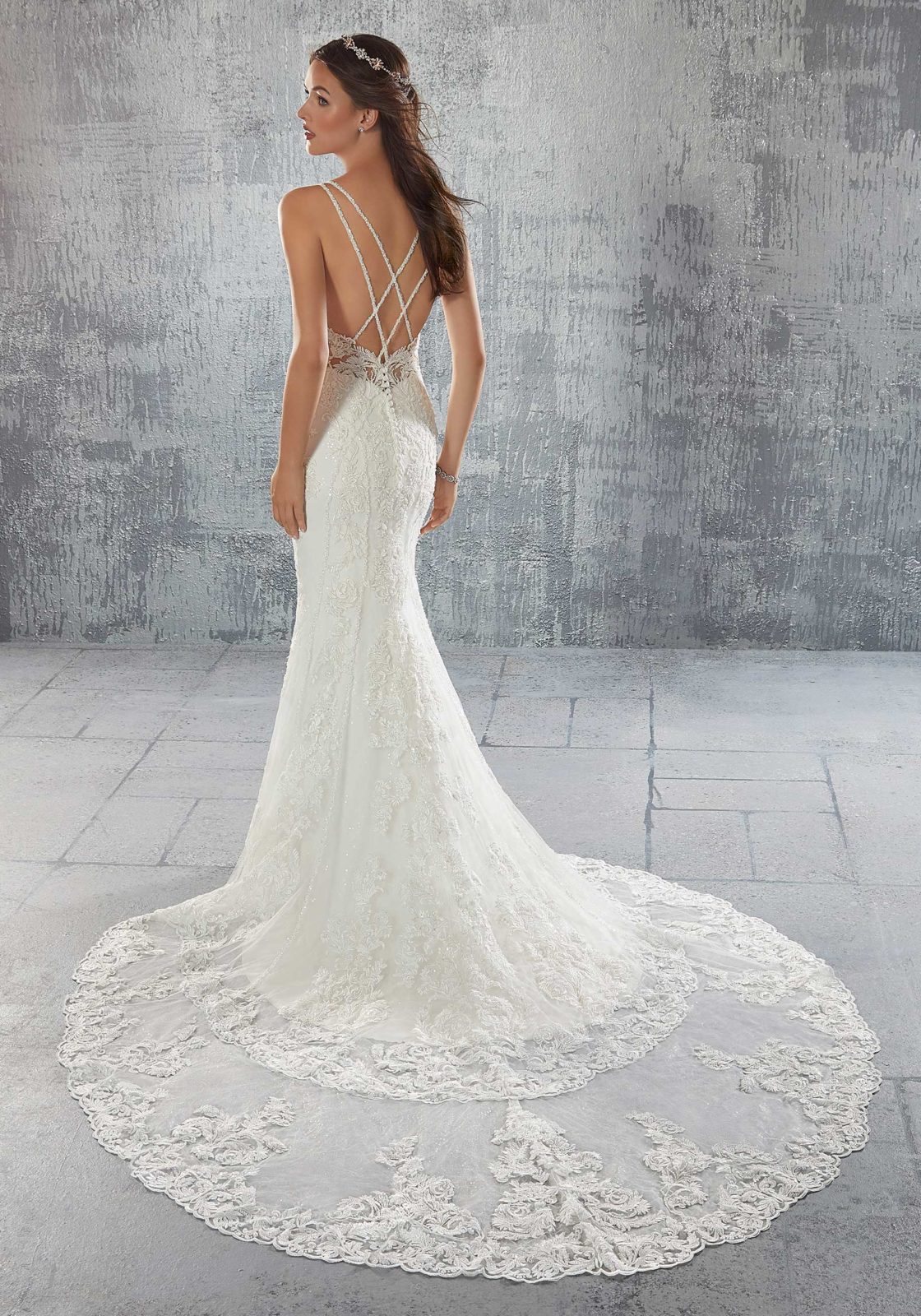 Sultry Suzette features intricately beaded crisscross double straps on an allover embroidered net, fit to flare silhouette. Sculptured trim and a wide scalloped hemline with two-tiered, sheer train complete the look on this designer wedding dress.