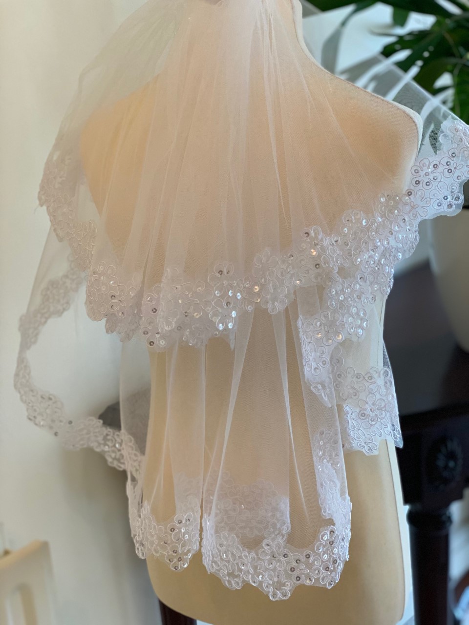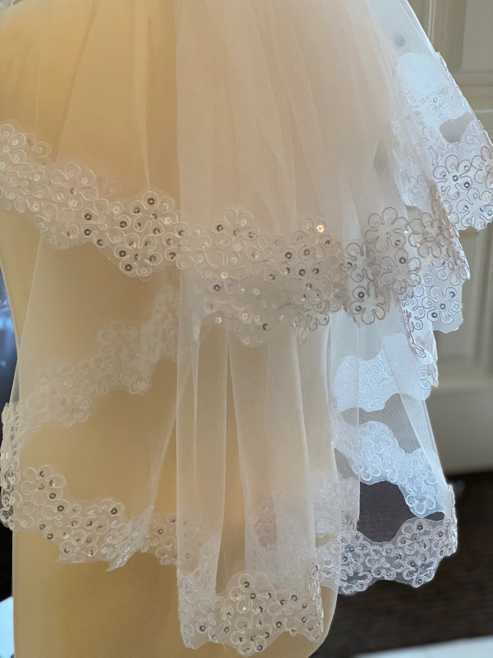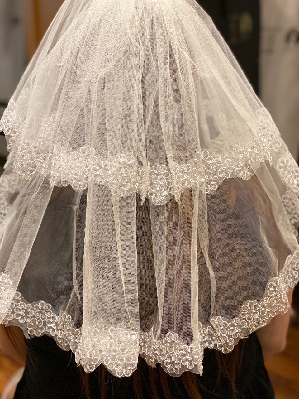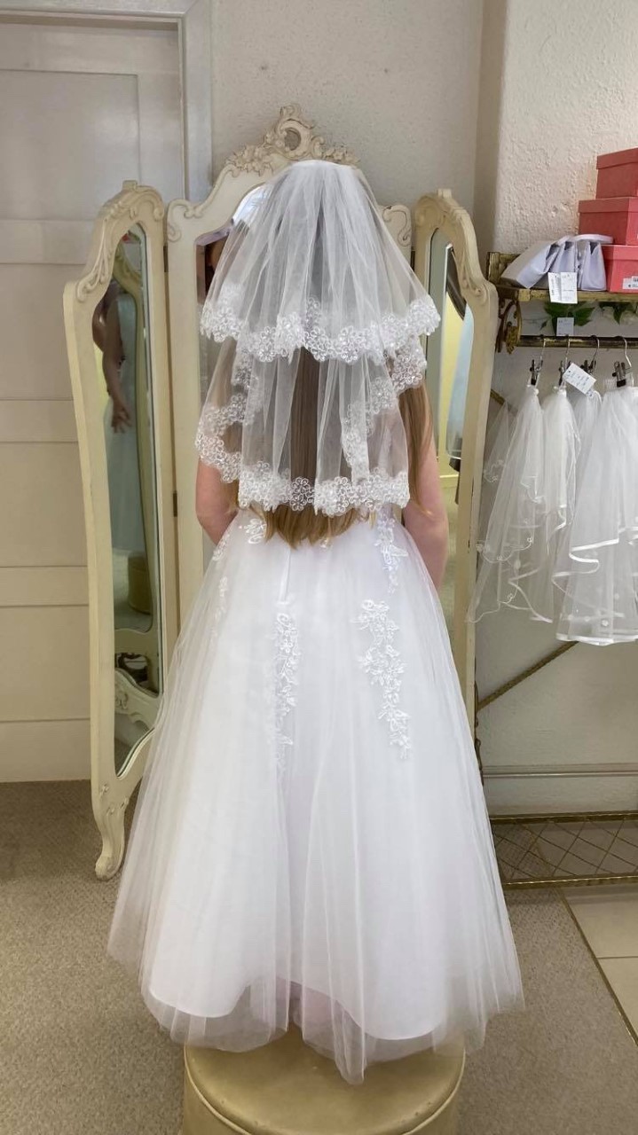 White communion veil with lace trim and sequin details. Two tiers with comb