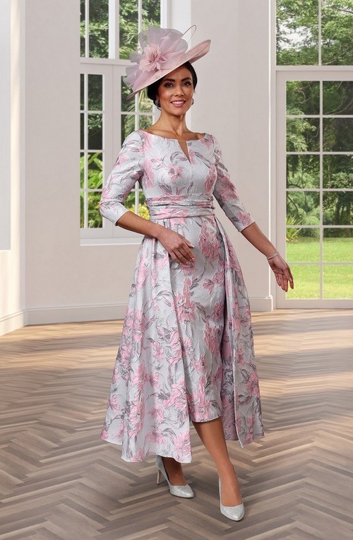 This is a beautifully feminine occasion dress with a soft, romantic elegance. Designed in a delicate pastel palette, it features a subtle floral print in blush pinks and muted greys set against a light base, giving it a refined and timeless feel. The fitted bodice is enhanced with a modest V-shaped neckline and three-quarter length sleeves. A gently defined waistband flatters the figure before falling into a fitted skirt with an overskirt behind. The length falls below the knee, making it ideal for formal daytime events.