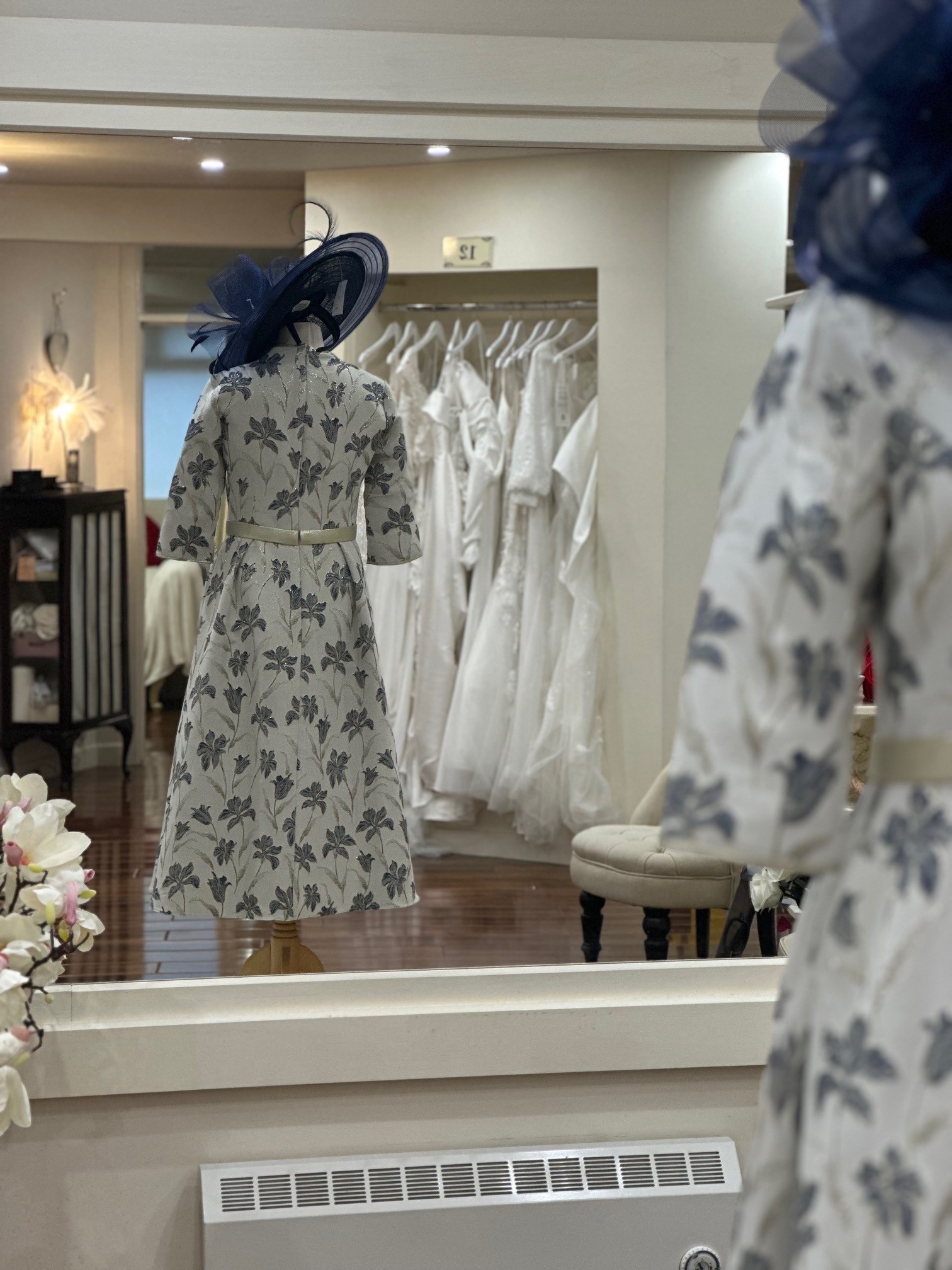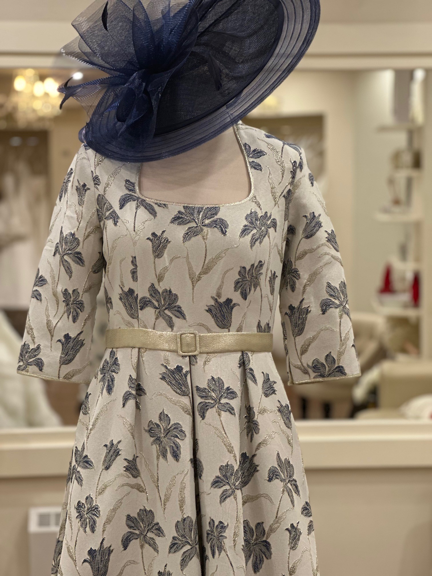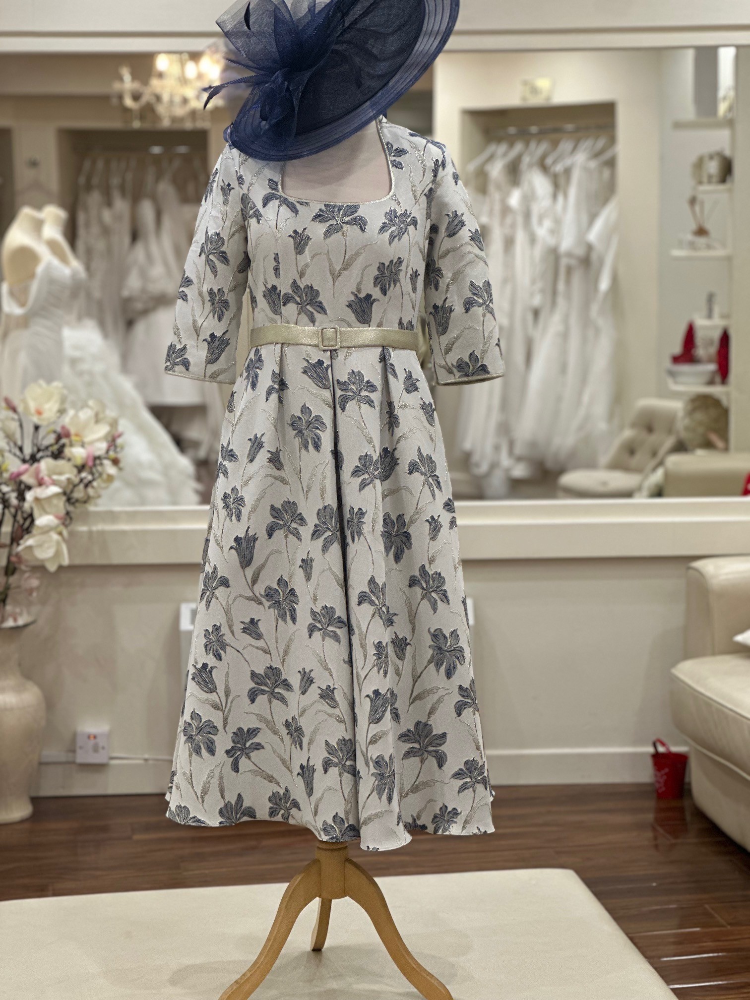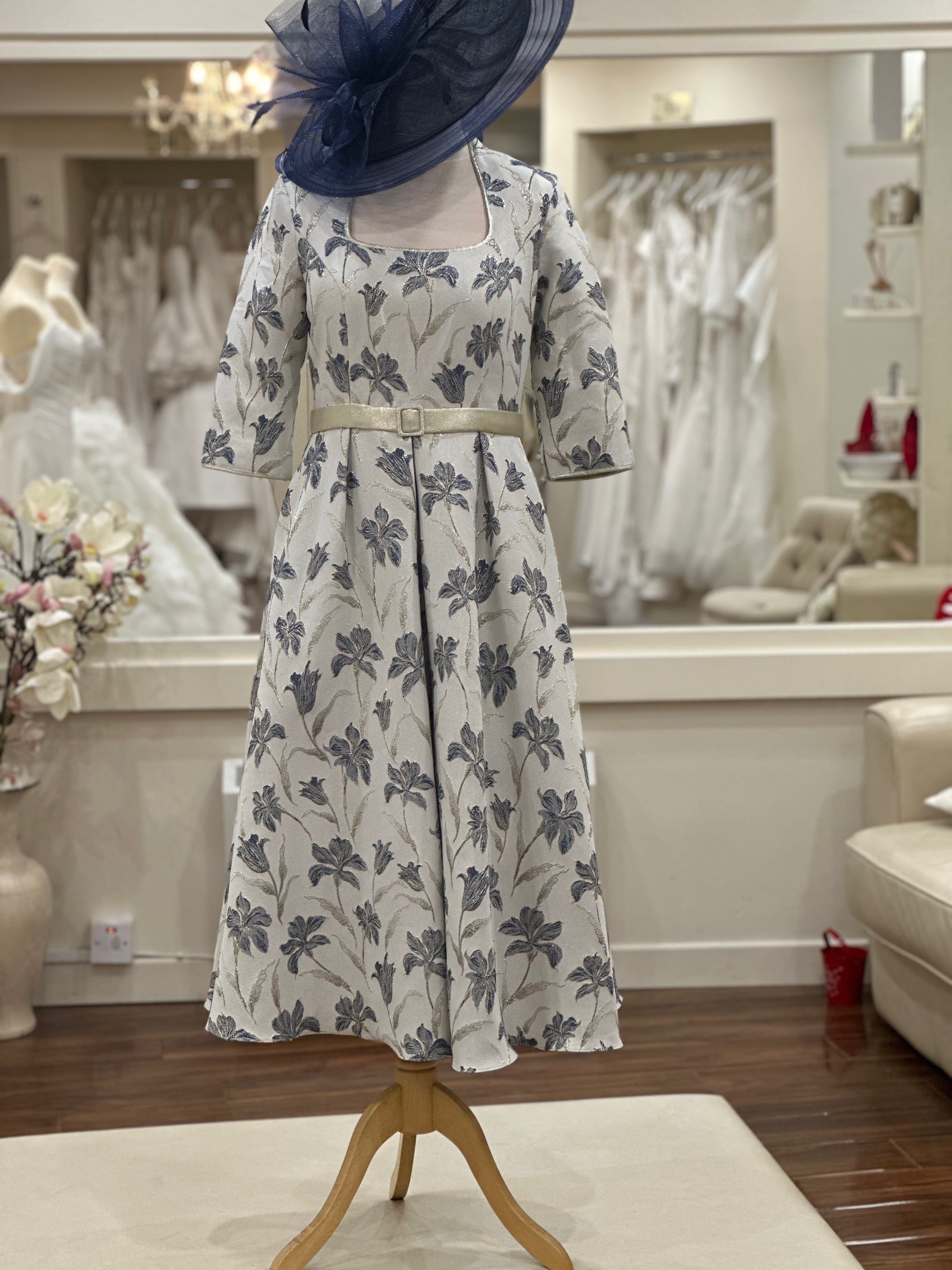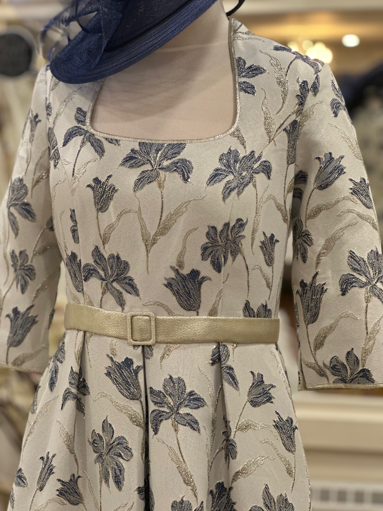 Crafted in a luxurious jacquard fabric, the soft champagne-gold base is intricately woven with navy floral detailing, creating depth, texture and a subtle shimmer as it moves. The structured bodice features a graceful square neckline that flatters the décolletage, while the three-quarter sleeves offer refined coverage ideal for special occasions.